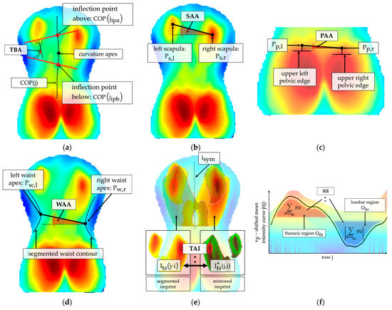 Figure 3. Visualization of the six extracted indices: (a) identified curvature apex in the center of pressure curve COP(j) with localized inflection points COP ( j ipa ) and COP ( j ipb , k ) for calculating the torsobarography angle (TBA) in association with the scoliosis angle; (b) localized pressure maxima in the area of the left P s , l and right P s , r scapula to calculate the shoulder asymmetry angle (SAA) in association with a height shift of the scapulae; (c) localized midpoint of the upper left P p , l and upper right pelvic edge P p , r with resulting pelvis asymmetry angle (PAA) as an index for pelvic obliquity; (d) left P w , l and right P w , r waist apices identified in the waist contour and angle between these two points as waist asymmetry angle (WAA); (e) superimposition of the segmented I ts ( j , i ) and mirrored segmented imprint I ts * ( j , i ) for determining the torso asymmetry index (TAI) to assess general pressure asymmetry of the imprint along symmetry axis i sym ; (f) v p ¯ -shifted mean intensity curve for determination of the area of pressure intensities in the thoracic and lumbar region for the calculation of the sagittal imbalance index (SII).