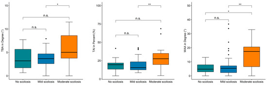 Figure 4. Range of torsobarography angle (TBA), torso asymmetry index (TAI), and waist asymmetry angle (WAA) for three severities of scoliosis with marked p-values for within-group comparison (not significant (n.s.): p ≥ 0.05, *: p < 0.05, **: p < 0.01).