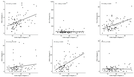 Figure 5. Correlation scatterplots between the Cobb angle and the following indices: torsobarography angle (TBA), sagittal imbalance index (SII), torso asymmetry index (TAI), shoulder asymmetry angle (SAA), waist asymmetry angle (WAA), and pelvis asymmetry angle (PAA), including a regression line for each relationship.