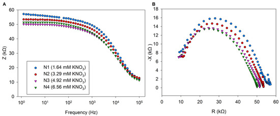 Changes in the bioimpedance spectroscopy of cucumber leaves as a dependence of frequency for samples with different N treatments. The plots represent the average impedance spectrum calculated from all measured samples within each N treatment (N1–N4). (A) Bode diagram representing the frequency dependence of impedance in cucumber leaves. (B) Cole–Cole plot illustrating the impedance characteristics of cucumber leaves.