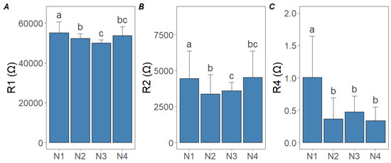 Significant differences were observed in the impedance parameters (, , and ) across the treatments. For resistance, the highest values were found in the N1 and N2 samples, with a decreasing trend as the N doses increased, followed by a slight increase in the N4 treatment (Figure 6A). For resistance, exceeded 0.90. Similarly, resistance was highest in the N1 treatment, progressively decreasing with higher N doses, reaching its lowest value in N3, and slightly increasing again in N4 (Figure 6B). For , resistance was lower ( = 0.67) than resistance. In contrast, resistance showed a significant decrease with increasing N doses, where N1 exhibited the highest resistance, while the N2, N3, and N4 treatments maintained consistently low values without significant differences (Figure 6C). These results suggest that N1 and N2 treatments increase resistance values, while higher doses cause a reduction, with minor variability observed among the N3 and N4 treatments. Regarding resistance, did not exceed 0.34.