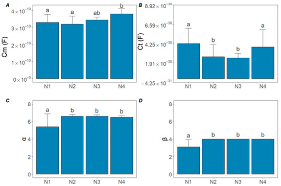 Results of the Double-Shell model with PSO optimization algorithm for the average of all four treatments on cucumber plants. (A) Cell membrane capacitance ( ); (B) vacuole membrane capacitance (); (C) α associated with the vacuole membrane; (D) β associated with the cell membrane. Lowercase letters indicate significant differences between treatments according to Tukey’s HSD, p < 0.05.