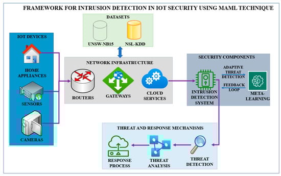 The Model-Agnostic Meta-Learning (MAML) technique is implemented to perform IoT security intrusion detection (Figure 1). Based on this framework, the model can learn new and different attack patterns from various IoT environments and improve intrusion or anomaly detection with high efficiency and accuracy.