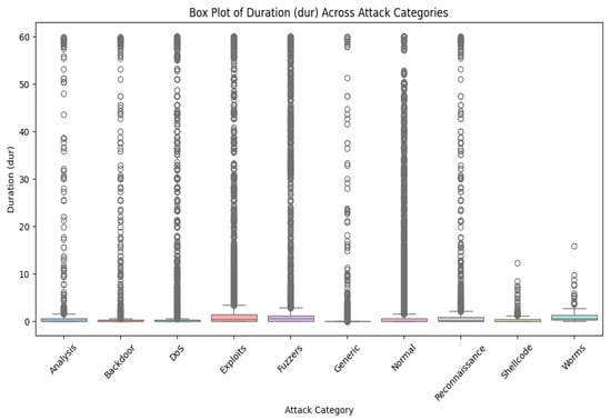 We will find it is misbalanced if we look at different classes in our dataset. So many classes here come from the MAML’s unique contribution in handling such a complex imbalanced dataset since this model can work fine on a small dataset. Further, Figure 2 shows the UNSW-BN15 intrusion type distribution. Figure 3 depicts the UNSW-NB class distribution outliers for duration time.