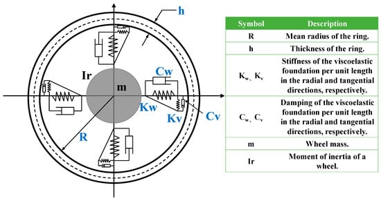 The flexible ring model regards each layer of the tire crown as a uniform homogeneous material when it is established, but in practice, the layers of the tire are different materials and thicknesses. Especially for the tread, it is a rubber specially configured for balancing wear, traction, handling, and rolling resistance, with a large thickness and stiffness. Therefore, the author believes that it is more appropriate to consider the elasticity and stiffness of the tread itself separately, and the ring in the flexible ring model is considered as the tire crown layer and its lower layers. This kind of treatment was first proposed by T. Akasaka [38] and used by K. Yamagishi [39] to solve the tire–road static contact problem. The improvement is to add a layer of radial spring distributed around the outer edge of the ring.