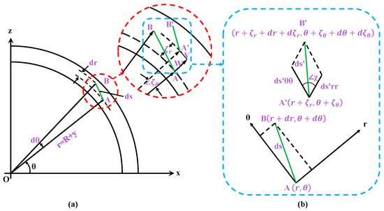 Then, the line segment before and after deformation is analyzed, as shown in Figure 2b. According to the definition of strain, the tangential and normal strains can be obtained as follows: