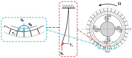 In this paper, for the tire tread part, the author improves it to a radial brush distributed along the circumference of the ring, and it has bending stiffness and length, similar to the brush model. The reason for this measure is that the brush model can make better use of the distributed load in the grounding area, and it can take tire wear into account in the model. As shown in Figure 3, it can be assumed that each brush bristle is subjected to tangential and vertical forces and . At this point, assuming that the brush bristles are modeled as cantilever beams fixed to a ring at one end and analyzing the forces on them, we can obtain the forces on the fixed end of the brush bristles, i.e., the points corresponding to the flexible ring are subjected to reaction forces of equal magnitude, and , as well as moments generated by the tangential forces, , where l is the length of the bristles, which is a variable that can be used to characterize the degree of wear of the tire when it is subjected to wear. This simplification allows tire wear to be taken into account in the subsequent analytical solution of the model.