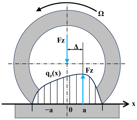 During the movement of the wheel, it is subjected to the vertical force, longitudinal force , and torque from the axle, as well as the distributed force , , and distributed torque from the ground. These external forces cause the deformation of the tire. The virtual work carried out by these external forces over the virtual displacements is as follows: