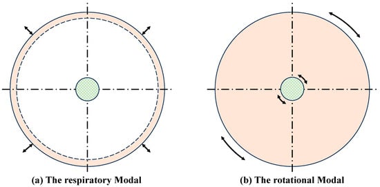 Schematic diagram of the zero-order mode of free tire vibration. (a) represents the respiratory modal in the radial direction, and (b) represents the rotational modal in the circumferential direction. The dash line represents the starting position of the ring, the solid line represents the vibration shape under this mode, and the arrow is used to indicate the vibration direction.