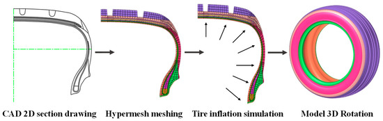 The modeling process of finite element model. The different colored parts in the finite element model represent different structures in the tire, such as tread, belt layer, inner liner, etc.