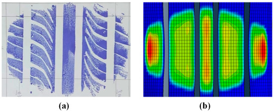 Contact pressure imprint test: (a) test results; (b) finite element simulation results, and the different color areas in the finite element simulation results represent the stress distribution in the grounding area.