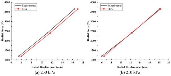 Stiffness test at different tire pressures. (a) shows the stiffness verification at a tire pressure of 250 kPa. (b) shows the stiffness verification at a tire pressure of 210 kPa.
