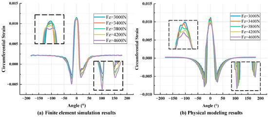 Strain signal curves under different loads: (a) finite element simulation; (b) physical model calculation.