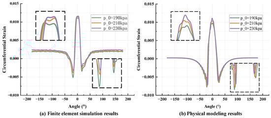 Strain signal curves under different tire pressures: (a) finite element simulation; (b) physical model calculation.