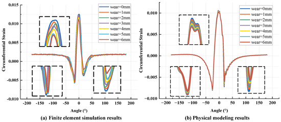 Strain signal curves under different wear: (a) finite element simulation; (b) physical model calculation.