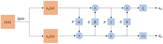 The structure of the lifting-based Daubechies 9/7 DWT is shown in Figure 2.