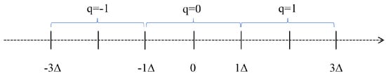 where c denotes the data to be quantized, and represents the quantized value. The quantization step size is , and n is an integer. The illustration of USQ is shown in Figure 3.
