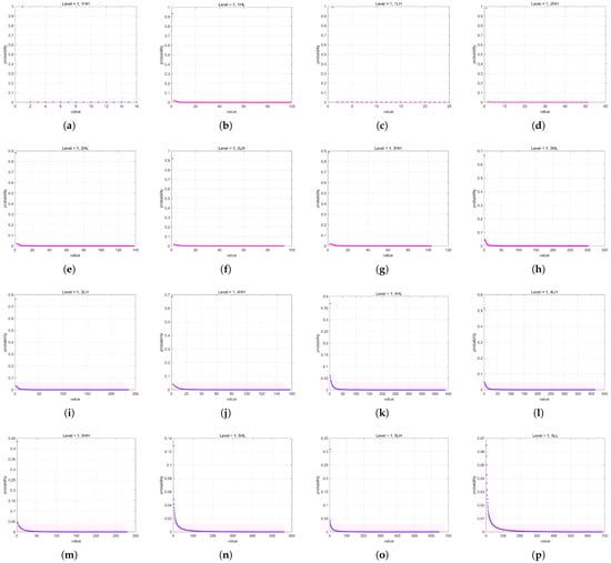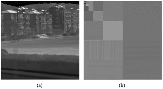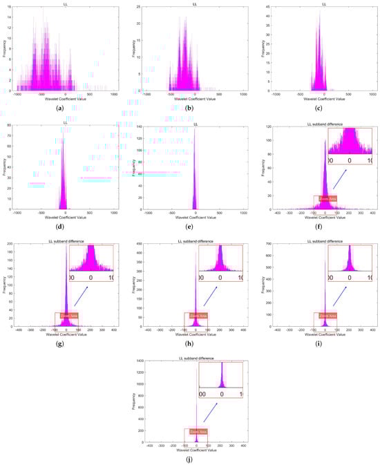In this paper, we used a 2048 × 2048 infrared line-scanning image (Image A) as an example, with its five-level DWT shown in Figure 5. The coefficient histograms of the three high-frequency subbands (LH, HL, HH) in the fifth-level DWT of Image A under different quantization levels are shown in Figure 6. It can be observed that as the quantization level increases, the sparsity of the wavelet coefficients intensifies, leading to more zeros.