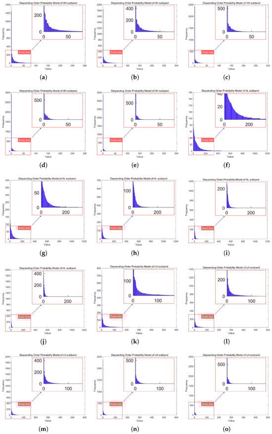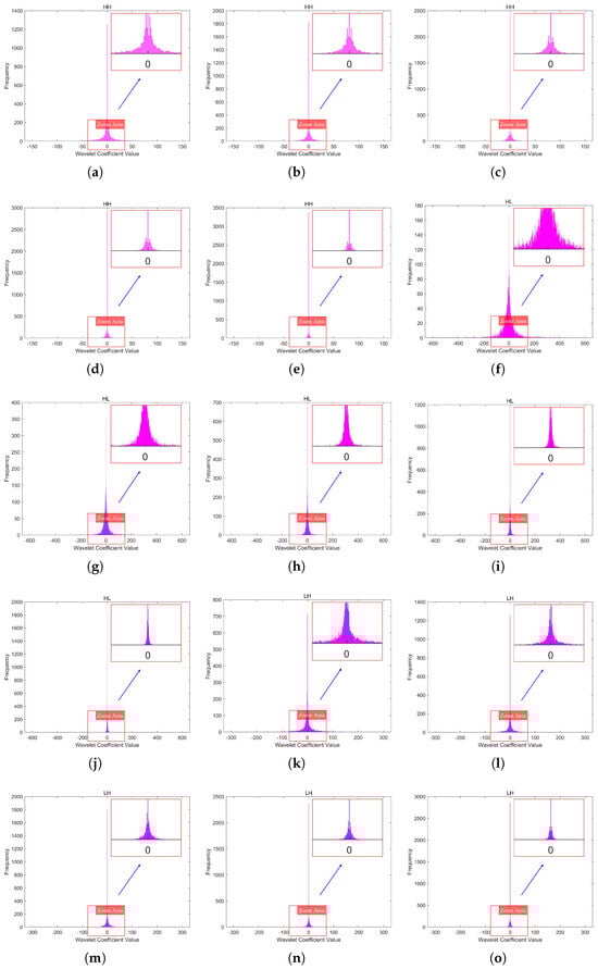 The coefficient histograms of the three high-frequency subbands(LH, HL, HH) in the fifth-level DWT of Image A under different quantization levels. (a–e) depict the coefficient histograms of the HH subband at the fifth level of Image A, corresponding to quantization levels 1 to 5. (f–j) depict the coefficient histograms of the HL subband at the fifth level of Image A, corresponding to quantization levels 1 to 5. (k–o) depict the coefficient histograms of the LH subband at the fifth level of Image A, corresponding to quantization levels 1 to 5.