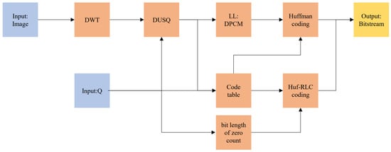 In JPEG2000, each subband uses an independent quantization step size, but the quantization step size within the same subband is uniform. The quantization is implemented using a quantization table [,]. JPEG2000 adopts Dead-Zone Uniform Scalar Quantization (DUSQ), an improvement of Uniform Scalar Quantization (USQ). This method sets a larger quantization step size near the zero region, removing more non-important information and further increasing the proportion of zero values. Properly setting the dead zone range can effectively reduce the number of output bits from the entropy encoder and improve compression efficiency [].