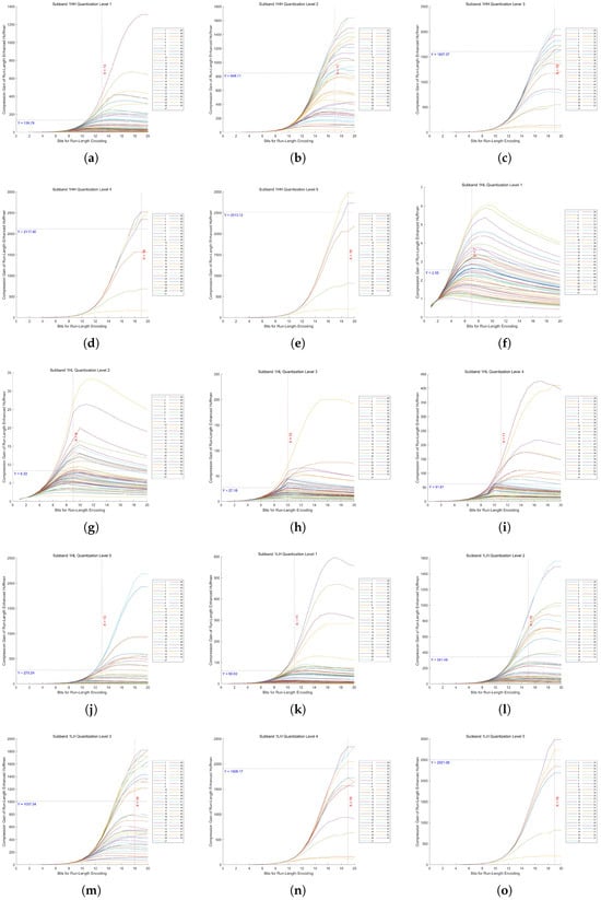 Compression gain vs. bit length in Huf-RLC for high-frequency subbands at decomposition level 2 across 53 images. (a–e) show the results of the HH subband at quantization levels 1 to 5, respectively. (f–j) show the results of the HL subband at quantization levels 1 to 5, respectively. (k–o) show the results of the LH subband at quantization levels 1 to 5, respectively.