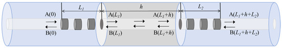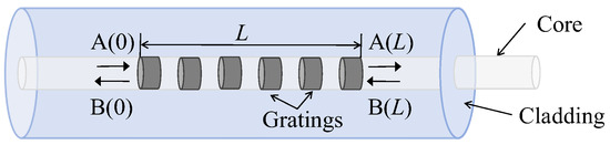 The transmission characteristics of FBG can be described using mode-coupling theory, transfer matrix theory, and Fourier transform theory. The first two can accurately analyze the coupling phenomena of light wave propagation in fiber gratings, while the Fourier transform method is only suitable for analyzing FBGs with low reflectivity. However, the mode-coupling equations are relatively complex. To facilitate calculations, the simplified mode-coupling equations can be solved using the transfer matrix. The forward and backward propagating light waves in FBG can be represented in matrix form as follows [27]: