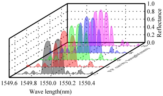 Since the grating length and FP cavity length influence the reflection spectrum characteristics of the FBG-FP cavity, thereby affecting the sensor’s sensitivity and demodulation accuracy, calculations are performed to analyze the impact of these parameters on the reflection spectrum. With the effective refractive index neff = 1.456, grating period Λ = 532.28 nm, refractive index modulation depth Δn = 1 × 10−4, and grating length L = 5 mm, the reflection spectra of the FBG-FP cavity under different FP cavity lengths are shown in Figure 3. The results indicate that as the FP cavity length increases, the reflection bandwidth and maximum reflectivity of the FBG remain unchanged. However, the number of resonance peaks within the FBG reflection bandwidth increases, and the spacing between resonance peaks decreases.