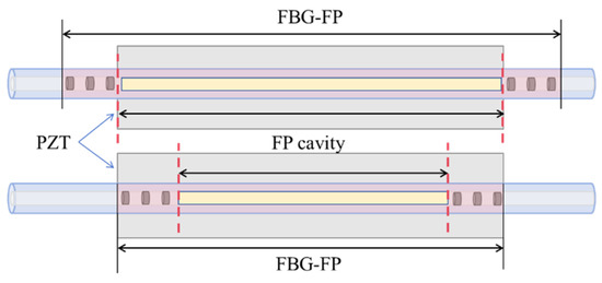 The FBG-FP transduction unit is formed by bonding the FBG-FP to the PZT surface using epoxy adhesive. Two bonding configurations exist: one involves bonding only the central FP cavity to the PZT surface, while the other bonds both FBGs and the FP cavity to the PZT surface. The two bonding configurations of the FBG-FP are illustrated in Figure 4.