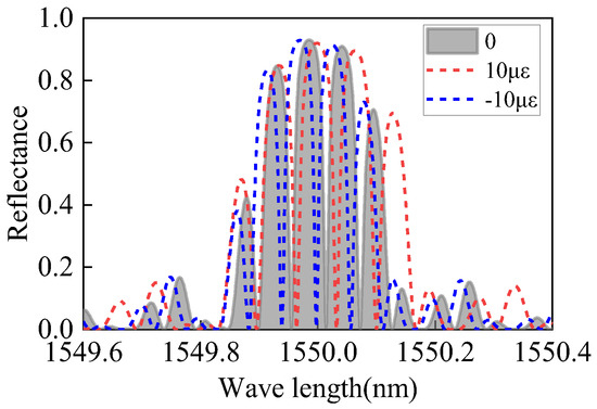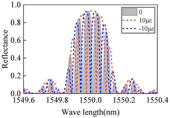 Using Equation (26), the strain-affected FBG-FP spectrum is calculated with the following parameters: FBG central wavelength λ = 1550 nm, refractive index modulation dept Δn = 1 × 10−4, grating length is 5 mm, FP cavity length is 10 mm, and the applied strain is ±10με (positive strain for PZT extension, negative strain for PZT compression). The calculated results are shown in Figure 5.