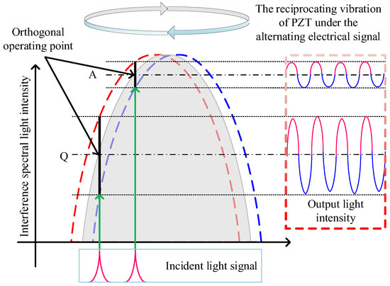 Fiber-optic sensors commonly employ two demodulation approaches: phase demodulation and quadrature intensity demodulation. Phase demodulation is more suitable for fiber-optic sensors utilizing two-beam interferometry, such as Mach–Zehnder or Sagnac interferometers. In contrast, quadrature intensity demodulation is better suited for multi-beam interferometric fiber-optic sensors with FP cavities. Therefore, this study adopts quadrature intensity demodulation for signal detection in the FBG-FP cascaded fiber-optic current transformer. This demodulation method employs a narrowband optical signal as the light source, incident on the spectral sideband of the sensor. The strain signal is demodulated within the linear region of the spectral sideband, as illustrated in Figure 8. Under sinusoidal strain excitation, the spectrum oscillates sinusoidally around the operating point, producing a sinusoidal electrical signal after demodulation. When no strain is applied, the demodulated output is a DC signal. Regarding the selection of the static operating point, it is typically set at the maximum slope location of the interference spectrum curve, where the highest sensor sensitivity and maximized linear dynamic range are achieved. If the static operating point is selected at point A, deviating from the maximum slope location Q, it not only significantly reduces sensitivity but also introduces nonlinear errors into the detection system. This phenomenon arises from the inherent nonlinear variation in the slope of the FP sensor’s interference spectrum within its longitudinal mode spacing interval, which is an intrinsic characteristic of FP sensor interference spectra.