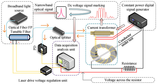When ambient temperature changes, the cavity length of the sensor’s Fabry–Pérot (FP) cavity is altered, causing a drift in the optimal static operating point of the sensor’s interference spectrum. This results in a mismatch between the optimal static operating point and the central operating wavelength of the narrowband optical signal, leading to unstable detection performance of the sensor. Therefore, it is necessary to adjust the central operating wavelength of the narrowband optical signal to ensure continuous alignment with the optimal static operating point of the sensor’s interference spectrum. To meet the requirement for adjusting the central operating wavelength of the incident driving optical signal, this study employs a combination of a broadband optical signal and a fiber-optic FP tunable filter to generate a narrowband optical signal. The principle involves filtering the broadband optical signal through the fiber-optic FP tunable filter to emit a narrowband optical signal. By applying a voltage to the fiber-optic FP tunable filter, the displacement of the internal piezoelectric ceramic actuator controlling the FP cavity length is adjusted, thereby regulating the central operating wavelength of the transmitted narrowband optical signal. This study utilizes PID closed-loop feedback control to dynamically adjust the fiber-optic FP tunable filter, enabling the central operating wavelength of the narrowband optical signal incident on the sensor to track the sensor’s optimal static operating point Q. The principle is as follows: the narrowband optical signal, after reflection from the sensor, is converted into a DC voltage signal by the photodetector. Assuming the central operating wavelength of the narrowband optical signal aligns with the sensor’s optimal static operating point Q, the DC voltage signal remains unchanged if no external action occurs. Thus, the amplitude of the DC voltage signal corresponds to the narrowband optical signal. When the sensor detects an AC current signal, the output voltage signal from the photodetector becomes an AC voltage signal, which still retains a DC voltage component. Specifically, the sum of the maximum and minimum values of the AC voltage signal equals twice the DC component. According to the intensity demodulation principle, when environmental temperature shifts the optimal static operating point Q, the DC component of the sensor’s output signal via the photodetector also changes. At this point, the fiber-optic FP tunable filter is adjusted to alter the central operating wavelength of the emitted narrowband optical signal, thereby realigning the DC component of the sensor’s output signal to match the amplitude corresponding to the optimal static operating point Q. To accurately determine the DC component, the average value of the sensor’s AC output signal over every 10 cycles is calculated, enabling precise adjustment of the fiber-optic FP tunable filter. This achieves temperature compensation for the sensor and completes the system’s closed-loop regulation. The schematic of the sensing and testing system is shown in Figure 9. The broadband optical source used in this study is the ASE-C LIGHT SOURCE, with an output optical signal wavelength range of 1520–1570 nm and an optical power of 100 mW. The fiber-optic FP tunable filter is the FFP-TF2 Tunable Filter provided by MICRON OPTICS (Atlanta, GA, USA). The photodetector is the PDA10CS-EC from THORLABS (Newton, NJ, USA), and the digital signal generator is the UTG932 Standard Function Voltage Signal Generator from UNI-T (Dongwan City, China).
