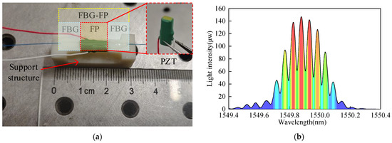 The fabrication of the FBG-FP is carried out first. The selected FBG parameters are as follows: grating length of 10 mm, central wavelength of 1549.954 nm, bandwidth of 0.228 nm, and maximum reflectivity of 92.92%. The FBG is cleaved at its midpoint using a fiber cleaver to obtain two FBG segments of equal length. A 10 mm single-mode fiber is fusion-spliced between the two FBG segments using a fiber fusion splicer to form the FP cavity, completing the fabrication of the FBG-FP. Subsequently, the FP cavity of the FBG-FP sensor is bonded and secured to the PZT sensor using epoxy resin. The fabricated sensor and its spectral diagram are shown in Figure 10. The spectrum was obtained using an AQ6370B optical spectrum analyzer provided by YOKOGAWA (Tokyo, Japan).