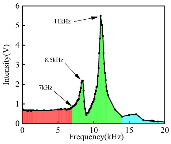 Prior to current measurement with the fiber-optic current transformer, the sensing probe’s detection bandwidth is tested. A digital signal generator directly supplies a fixed 500 mV AC voltage to the sensing probe. The output frequency is incrementally adjusted from 50 Hz (in 50 Hz steps) to 1 kHz, followed by 0.5 kHz steps until resonance occurs. The frequency is further increased until resonance fully dissipates. The amplitude–frequency characteristic curve of the sensor is shown in Figure 11. Experimental results reveal that the sensor’s output signal peak-to-peak value increases at 7 kHz, with distinct resonance observed at 11 kHz. Thus, the sensor’s detection bandwidth is determined as 0–7 kHz, fully sufficient for power-frequency current detection.