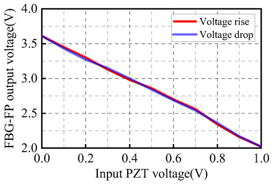 Piezoelectric ceramic materials exhibit hysteresis, which introduces nonlinearity in output displacement and affects sensor measurement performance. However, hysteresis characteristics are strongly dependent on the applied voltage. To investigate the hysteresis of the PZT under low-voltage driving signals, a digital signal generator supplies a DC driving voltage signal ranging from 0 to 1 V with a step size of 0.1 V. The DC component voltage amplitude of the FBG-FP sensor output is recorded at each voltage level. At 0 V, the central operating wavelength of the narrowband optical signal is positioned at the optimal working point Q. Experimental results (Figure 12) show nearly overlapping curves for voltage increase and decrease, indicating negligible hysteresis in the PZT sensor under low-voltage driving signals.