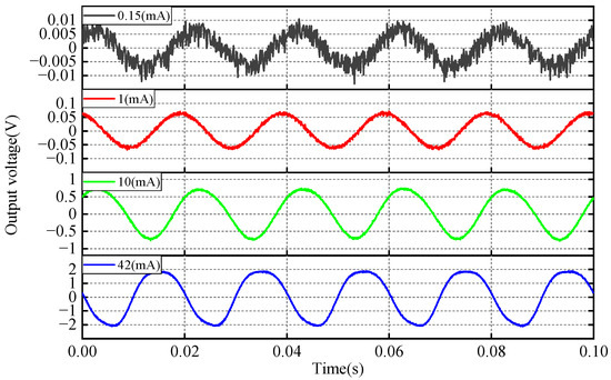 A current measurement system is constructed based on Figure 9, comprising a signal generator, measured busbar, resistors, the FBG-FP sensor, broadband light source, fiber-optic FP tunable filter, photoelectric converter, and oscilloscope. The principle involves inducing a voltage in the magnetic core’s coil when current flows through the busbar. This voltage drives the PZT to generate strain, altering the FP cavity length. The demodulation system reconstructs the current signal and displays it on the oscilloscope. To generate small currents, a 250 Ω resistor is connected in series with the busbar (inherent resistance: 0.88 Ω). The voltage across the resistor is measured by the oscilloscope, and the actual current is calculated by dividing this voltage by the resistance. Output voltage waveforms under different currents are shown in Figure 13. When the measured bus current is 0.15 mA, the sensor’s output signal exhibits a peak-to-peak value of 20 mV, with a system signal noise of 5 mV. For this condition, the signal-to-noise ratio (SNR) is 6.02 dB. When the measured bus current decreases further, the sensor’s output signal peak-to-peak value reduces accordingly, causing the SNR to fall below 6 dB, and the interference of system noise on current detection accuracy increases; thus, 0.15 mA is defined as the minimum measurable current of the FBG-FP sensor. At 1 mA and 10 mA, the output voltage waveforms exhibit good fidelity. When the current reaches 42 mA, the output voltage peak-to-peak value reaches 3.8 V, beyond which waveform distortion becomes significant. This defines the maximum measurable current, resulting in a measurement range of 0.15 mA to 42 mA for the FBG-FP sensor. According to Equation (33), the coil output voltage is only 1.58 V at a busbar current of 1 A. Combined with the low-voltage hysteresis analysis, the sensor can accurately reconstruct the measured current signal within the 0.15 mA–42 mA range.