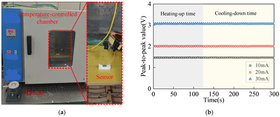 During heating tests, the chamber door is closed to raise the internal temperature. For cooling, the door is opened, and the heat source is turned off. Throughout the experiments, the vibration exciter operates cyclically at frequencies between 0.1 and 2 kHz. Figure 14b illustrates the variation in the peak-to-peak signal amplitude during heating and cooling for different measured currents. The chamber’s internal temperature rises from 20 °C to 50 °C in 2 min and cools to room temperature in 3 min. Experimental results demonstrate no significant variation in the sensor’s output signal amplitude, indicating that the proposed temperature compensation method effectively enables accurate current detection across varying environmental temperatures.