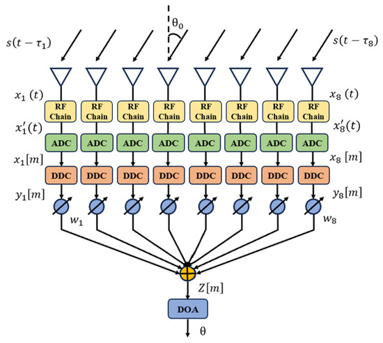 This step reduces the processing burden on the ADC. The ADC then converts x′(t) into a digital signal, which is subsequently processed by the digital beamformer. Since the digital beamformer operates directly x′(t), and the direction-of-arrival (DOA) estimation is theoretically unaffected by the carrier frequency, this design focuses primarily on the ADC and IF signal processing stages. To simplify the model, we assume an ideal RF front-end and antenna array, with no mutual coupling between antenna elements and no additional noise or nonlinear effects introduced by the RF circuitry. For completeness, however, we assume a carrier frequency of fc = 1 GHz and an antenna spacing of d = λ/2.