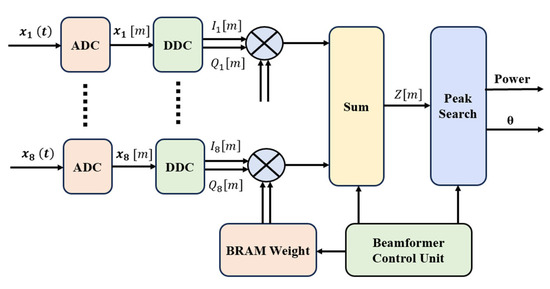 - Chen, W.; Lv, W.; Fu, L.; Su, Y. Implementation of Wideband DBF for Large Aperture Phased Array Radar Based on FPGA. In Proceedings of the 2023 5th International Conference on Electronics and Communication, Network and Computer Technology (ECNCT), Guangzhou, China, 18–20 August 2023; pp. 113–116. [Google Scholar] [CrossRef]