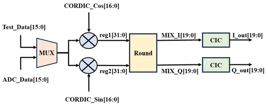 Figure 3 illustrates the digital down-conversion module, which first performs digital down-conversion on the input eight-channel signals. Each channel includes digital mixing and low-pass filtering operations. The input signals are represented as 16-bit fixed-point numbers. The mixer uses a numerically controlled oscillator (NCO) to generate 17-bit fixed-point sine and cosine signals. The NCO is implemented using a structure based on the CORDIC algorithm. Each receiving channel employs two mixers to mix the input data with the orthogonal sine and cosine signals generated by the NCO, resulting in 32-bit high-frequency and low-frequency signals. To reduce computational pressure in subsequent stages, a truncation module is used to truncate the 32-bit fixed-point numbers to 20 bits. A CIC filter then removes the high-frequency components, ultimately yielding two IQ orthogonal baseband signals.
