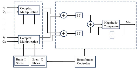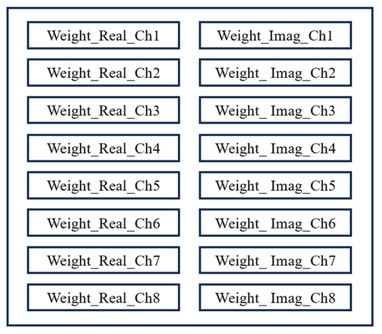 During the beamforming weight loading stage, the module loads the real and imaginary parts of the weights separately from the Block Random Access Memory (BRAM), as shown in Figure 4. It then performs complex multiplication for each channel signal to obtain the weighted intermediate-frequency signal. The weight memory is implemented using dual-port BRAM, with separate storage units for the real and imaginary parts of each channel, supporting parallel reading and real-time updates. The bit width and depth of the BRAM can be adjusted according to the phase-shifter scanning step size. The complex multiplier adopts a pipelined structure to improve computational throughput and supports complex multiplication of 20-bit input signals with BRAM weights.