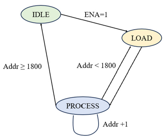 The state machine is triggered by the rising edge of the clock and performs state transitions based on the current state, enable signal (ENA), and address value (Addr). As shown in Figure 6, when the reset signal rst_n is set low, the state machine returns to the initial IDLE state. In the PROCESS state, the addr value increments with each clock cycle to ensure sequential reading of data from the BRAM. During reset, the address register is cleared. The load control signal load_enable is set high only in the LOAD state to control the data input for the complex multiplier.