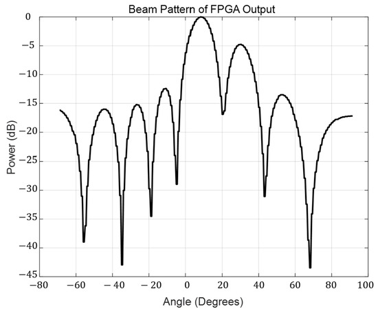 The simulation output waveform of the beamforming is shown in Figure 8. The array forms a main lobe at a scanning angle of 8°, with a side lobe formed next to the main lobe. It can be seen that the digital beamformer is capable of distinguishing between the main signal and the interference signal and provides an estimation of the arrival angle of the main signal. It can be observed that the beamformer forms a main lobe at 8° and a side lobe at 29°. The main lobe width, defined by the half-power beamwidth (HPBW), is 12.5°, and the main lobe width, defined by the distance between the nulls of the main lobe (FNBW), is 45.84°. The power difference between the main lobe and the side lobe is 4.8 dB.