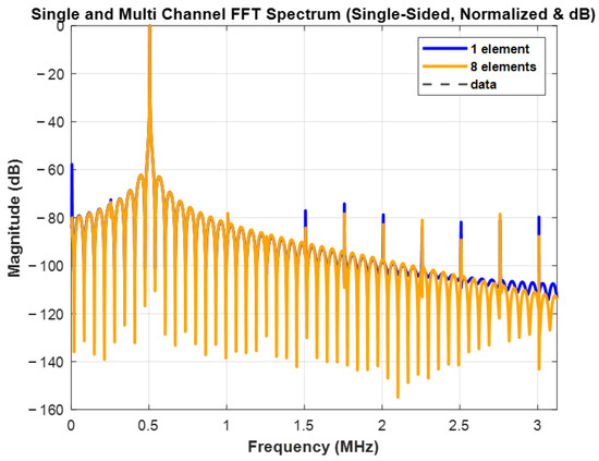 By fixing the complex weights of the beamformer according to the DOA detection values and performing FFT spectrum analysis on the output signals of both the single-channel and eight-channel systems, the results are shown in Figure 9. The blue curve represents the spectrum of the single channel, while the orange curve represents the spectrum of the eight channels. Both the single-channel and eight-channel systems sample 65,536 complex points, with FFT performed in MATLAB to plot the single-sided spectrum. From the figure, it can be observed that using eight channels results in higher gain in the lower frequency range compared to using a single channel. When synthesizing with eight channels, the main peak of the spectrum becomes more concentrated, the main lobe width narrows, and the gain increases. This demonstrates that using more array elements improves the system’s directionality and spectral resolution. Increasing the number of array elements enhances the system’s ability to focus on the target signal while reducing the influence of surrounding noise.