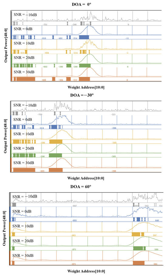 Then, we changed the input signal’s angle and performed DOA simulation one by one in VIVADO. The FPGA clock frequency was set to 100 MHz. Figure 10 shows the output of the beamformer when the input angles are 0°, −30°, and 60°. The Output Power represents the result of beamforming the eight-channel signals with different weights, expressed as a 49-bit fixed-point number with the highest bit as the sign bit. The Weight Address is the address of the weight, expressed as an 11-bit fixed-point number. Due to linear scanning, each address directly corresponds to a weight angle. In the simulation, we verified two cases with scan steps of 1° and 0.1°.