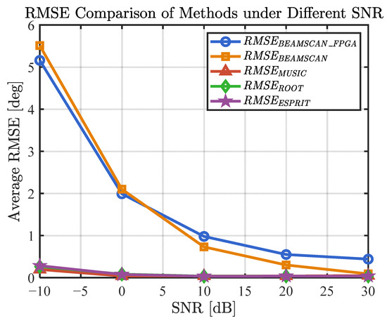 Figure 12 compares the RMSE performance of different DOA methods under varying SNR conditions. In low-SNR scenarios (SNR = 0 dB), the beamforming DOA has poor interference resistance, with an RMSE > 2°. In typical application scenarios (SNR = 10 dB), the RMSE of the beamforming DOA is <1°, and it can be used normally. In high-SNR scenarios (SNR = 30 dB), due to the limitation of quantization errors in the FPGA-implemented beamforming method, the RMSE is approximately 0.44°. In MATLAB simulations, where quantization errors are not considered, the best achievable RMSE for beamforming DOA is approximately 0.09°, but it is still higher than that of MUSIC (0.05°), ROOTMUSIC (0.04°), and ESPRIT (0.04°).