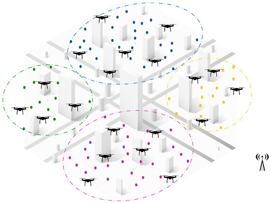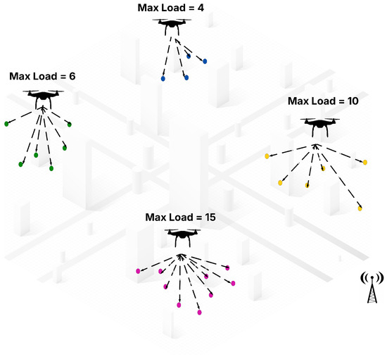Figure 1 provides a visual example of the multi-UAV dynamic task assignment problem as formulated in this study. In this scenario, multiple UAVs are deployed within an urban environment, each assigned a distinct set of tasks represented by colored dots. The assignment respects two key constraints: each task is assigned to only one UAV, and each UAV cannot exceed its maximum load capacity, as indicated by the “Max Load” label next to each UAV. This reflects the mathematical constraints defined in Equations (6b) and (6c), which ensure that UAVs operate within their capacity limits and that tasks are uniquely assigned. The spatial distribution of tasks further illustrates the complexity of the problem in terms of travel distance and time constraints, while the centralized antenna symbol hints at the presence of a supervisory controller that facilitates coordination. This diagram helps readers intuitively understand the objective of the problem—to assign tasks to UAVs in a way that maximizes overall mission efficiency, while satisfying operational constraints.