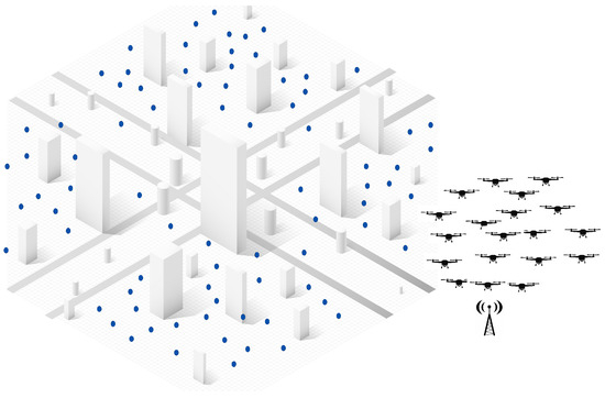 The multi-UAV dynamic task assignment problem is an NP-hard combinatorial optimization problem [7,33,57] that can be described as follows: Given a set of N UAVs , each UAV is defined by the payload capacity (), the velocity (), lidar sensor (), and the assigned tasks list (), with distinct capabilities for each U. The UAVs are heterogeneous, as they differ in payload capacity and velocity, which directly affects their execution time for the same task. A significantly larger set of M tasks is also defined as , where . Each task is characterized by four attributes: start time (), end time (), duration (), and reward (). Each task can be performed by, at most, one UAV, and each UAV can perform one task at a time and be assigned to multiple tasks. This specific problem is described as a single-task (ST), single-robot (SR) problem [19]. The mission environment is dynamic and may experience sudden events such as the emergence of new tasks, and failure or idleness of UAVs. The common objectives of the problem are to find an assignment of UAVs to tasks that optimizes the predefined objectives: maximizing the UAV throughput and minimizing the task waiting time costs. Furthermore, when a sudden event occurs, the original assignment is dynamically adjusted, and the UAVs autonomously adapt to these changes. The problem can be mathematically formulated as follows: