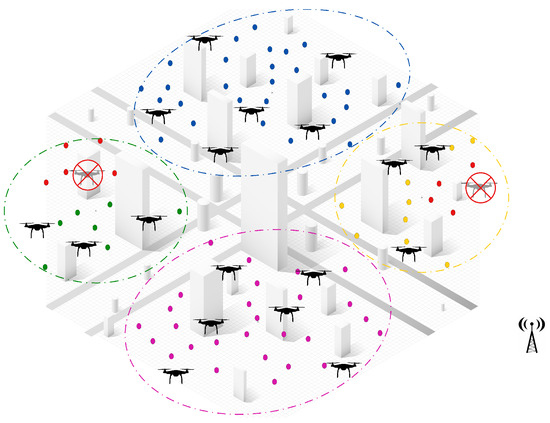 Figure 5. Two UAVs have failed during their missions, one in the green cluster and another in the yellow cluster, with their unperformed tasks marked by red points. - UAV Idleness: In a dynamic operational environment, a UAV may enter an idle state after successfully completing all its assigned tasks. To ensure optimal resource utilization and task coverage, the central controller manages idle UAVs through the following steps: