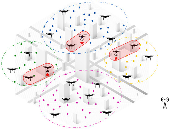 - Intra-Cluster Assistance: If there are no new or unassigned tasks but the current cluster still requires coverage, the central controller directs an idle UAV to assist the most heavily loaded UAV in its cluster. This ensures efficient workload balancing within the cluster, optimizing resource utilization, without unnecessary UAV downtime. As shown in Figure 6, the idle UAV in the blue cluster (highlighted circle) is directed by the central controller to support the busiest UAV in the same cluster.