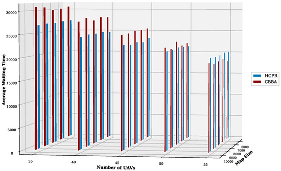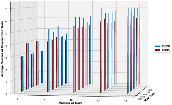 In scenarios (1) and (2), HCPR did not utilize the partial reassignment process, and task clustering had no effect. The reason for the superiority of HCPR compared with TS-DTA was the deployment of an idle UAV handler, since one of the UAVs was not assigned in the initial assignment and thus was available to handle the detected new tasks and all unperformed tasks for the failed UAV.